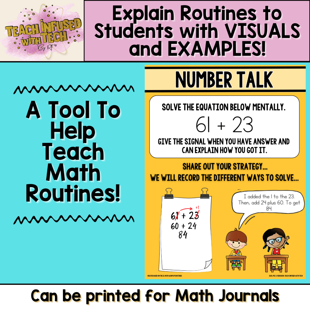 The posters can be displayed in the classroom as a visual reminder to integrate them daily in your instruction. Each poster contains the routine and a visual example (clip art/picture) of the practice.