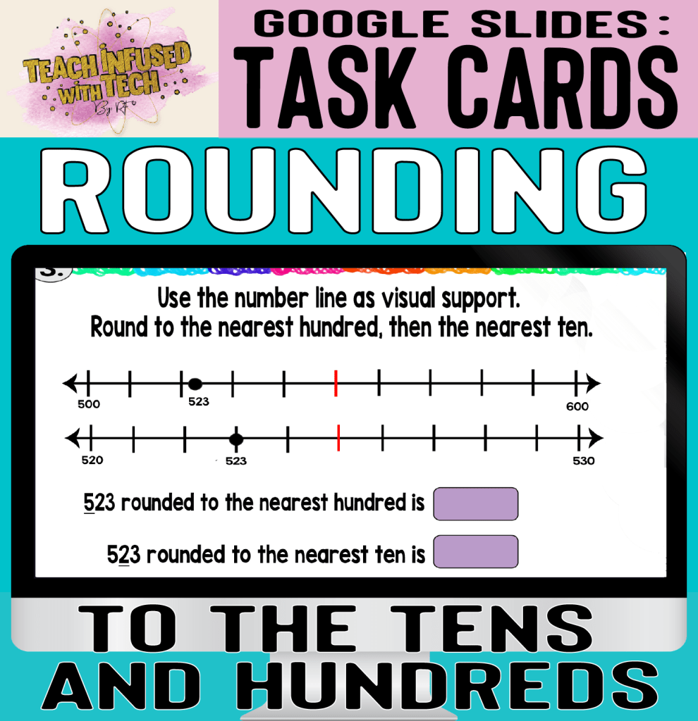 This resource is a set of digital task cards created in Google Slides on the skill of rounding to the tens and hundreds place. The set includes 4 instructional task cards, and 20 skill practice cards that provide gradually reducing visual support to assist students conceptual understanding of the skill. The supports less to independent practice to gauge students conceptual understanding of rounding numbers to the nearest 10 and 100 place. Targeted to 2nd, 3rd Grade and 4th grade (review).
